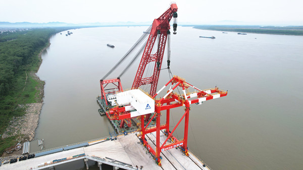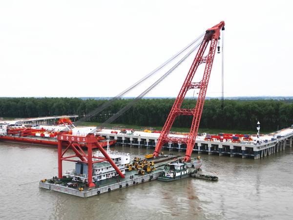 為加快工程進(jìn)展,該項(xiàng)目首臺(tái)岸橋從今年1月下旬開始制作到總裝完成只用了5個(gè)月時(shí)間。由于長(zhǎng)江航道上眾多橋梁限高及碼頭與江面標(biāo)高影響,岸橋不具備整機(jī)運(yùn)輸上岸條件。為此,公司項(xiàng)目團(tuán)隊(duì)與生產(chǎn)廠家充分討論并精心策劃,不斷優(yōu)化設(shè)備運(yùn)輸及現(xiàn)場(chǎng)總裝方案,最終采取了在生產(chǎn)基地預(yù)拼后拆成散件裝船,再發(fā)運(yùn)至碼頭進(jìn)行總裝的方式。