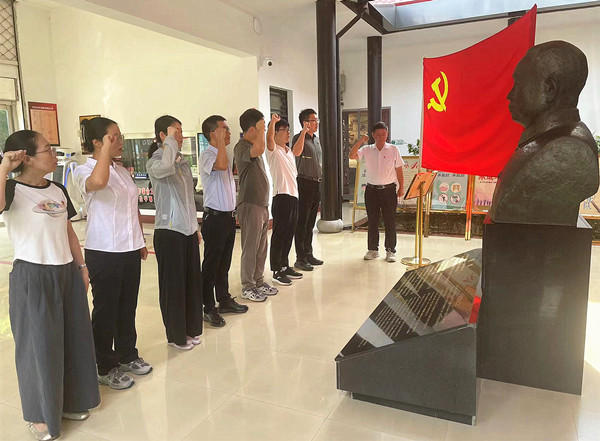 在講解員的詳細(xì)解說下,大家依次參觀了黃鎮(zhèn)紀(jì)念館的各個展區(qū),通過現(xiàn)場圖片、實(shí)物、雕塑等陳列物品,黨員們深入了解黃鎮(zhèn)同志的生平事跡和革命精神,被老一輩無產(chǎn)階級革命家廉潔樸素、嚴(yán)于律己、追求真理、對黨和人民無限忠誠的高尚品質(zhì)深深感動。在黃鎮(zhèn)紀(jì)念碑前,全體黨員面對黨旗重溫入黨誓詞,緬懷先輩的豐功偉績,向革命先輩致以崇高的敬意。