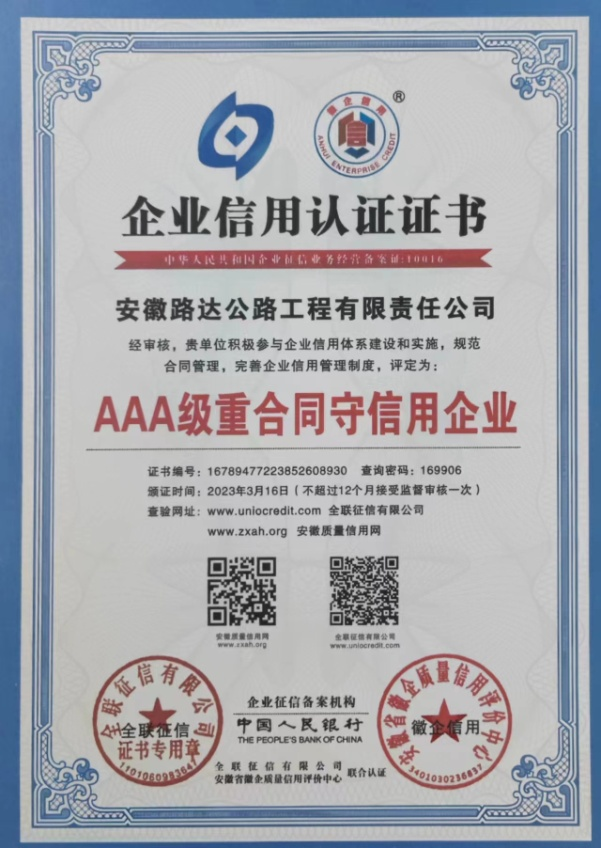 近日,經(jīng)全聯(lián)征信有限公司和安徽省徽企質(zhì)量信用評(píng)價(jià)中心聯(lián)合認(rèn)證,安徽路達(dá)公司榮獲“AAA級(jí)重合同守信用企業(yè)”。