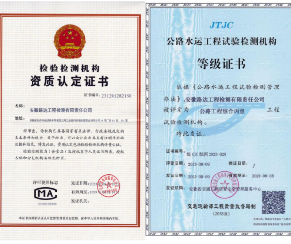 近日,安徽路達工程檢測有限責任公司成功獲批檢驗檢測機構資質認定和公路水運檢測綜合丙級兩項資質證書,這標志著檢測公司已具備相關法規(guī)和行業(yè)主管部門規(guī)定的基本檢測條件和能力,可以正式向社會出具具有法律效力的檢驗檢測報告。